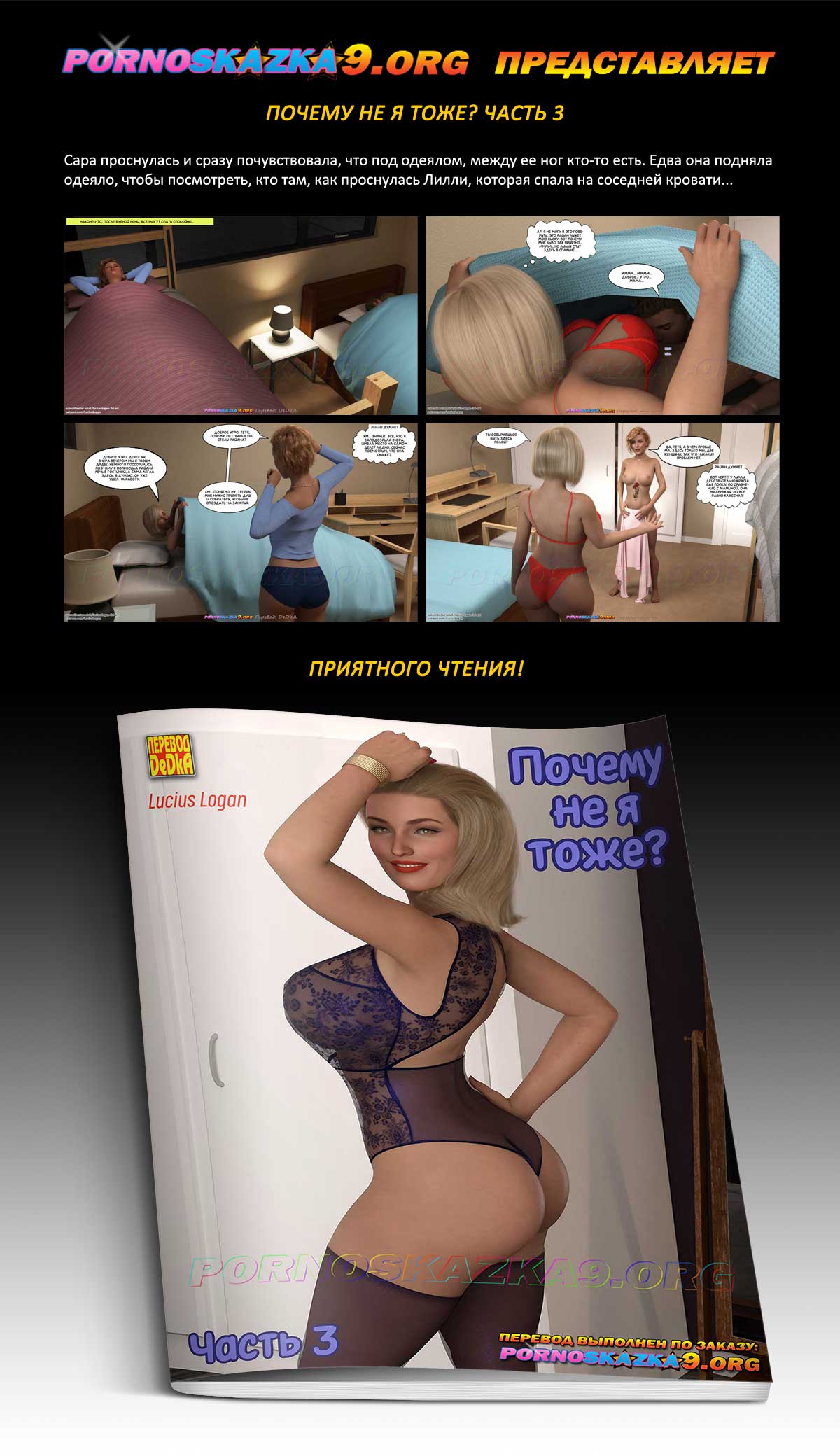Порно комикс «Почему не я тоже? Часть 3.» Сара проснулась и сразу почувствовала, что под одеялом, между ее ног кто-то есть. Едва она подняла одеяло, чтобы посмотреть, кто там, как проснулась Лилли, которая спала на соседней кровати!